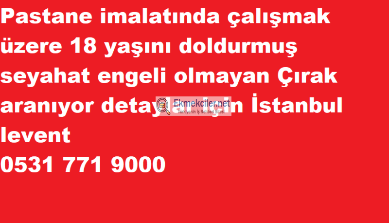 Çırak aranıyor Pastane imalatında çalışmak üzere 18 yaşını doldurmuş seyahat engeli olmayan Çırak aranıyor detaylar için İstanbul levent 05317719000