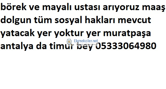 börek ve mayalı ustası arıyoruz maaş dolgun tüm sosyal hakları mevcut yatacak yer yoktur yer muratpaşa antalya da timur bey 05333064980