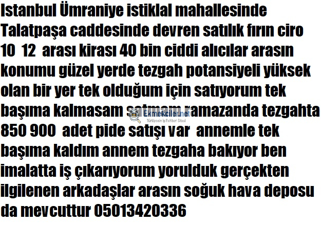 Istanbul Ümraniye istiklal mahallesinde Talatpaşa caddesinde devren satılık fırın ciro 10 12 arası kirası 40 bin ciddi alıcılar arasın konumu güzel yerde tezgah potansiyeli yüksek olan bir yer tek olduğum için satıyorum tek başıma kalmasam satmam ramazanda tezgahta 850 900 adet pide satışı var annemle tek başıma kaldım annem tezgaha bakıyor ben imalatta iş çıkarıyorum yorulduk gerçekten ilgilenen arkadaşlar arasın soğuk hava deposu da mevcuttur 05013420336