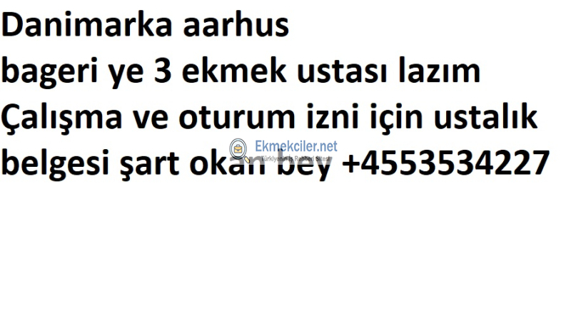Danimarka Århus tá Istanbul firin icin 3 ekmek ustasi alinacak gercekten iyi Usta olmasi gerekiyor ve ustalik belgesi olmasi gerekiyor bu belgenin bazi kurslardan parayla alinmamis olmasi gerekiyor cunku parayla alinan diplamalarin burda hic bir kabulu Yok isimiz gunluk 10 :12 saat suruyor cift vardiye calisiyoruz kalacak yer bana ait Maas olarak elinize 21000kr Danimarka kuronu geciyor calisma izninizi aldiktan bir veya bir Bucuk yil sonra aylenizi getirmek icinde bas vurabilirsiniz gelmek isteyen arkadaslar daha detayli bilgi icin beni bu tlf nr araya bilirler +4553534227 ve bana yaptiklari ekmek cesitlerinin mayali mayasiz ne yapiyorsaniz videosunu bana atmanizi rica ediyorum egerki sartlara uygun ustalar bulursam daha detayli gorusmek icin istanbula gelip bire bir oturup konusurum saygilar Okan Kevioglu Istanbul firin.