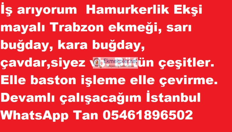 İş arıyorum Hamurkerlik Ekşi mayalı Trabzon ekmeği, sarı buğday, kara buğday, çavdar,siyez vb. Bütün çeşitler. Elle baston işleme elle çevirme. Devamlı çalışacağım İstanbul WhatsApp Tan 05461896502