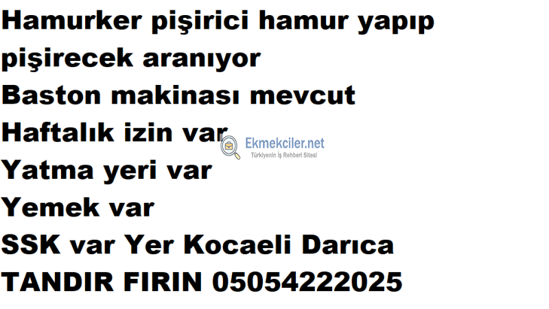 Ekmek ustası Hamurker pişirici araniyor Yer Kocaeli Darıca 05054222025