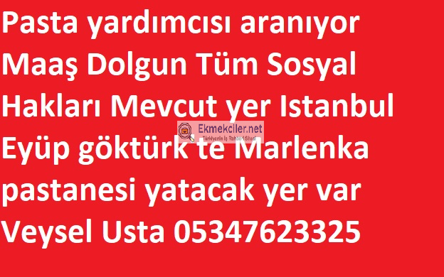 Pasta yardımcısı aranıyor Maaş Dolgun Tüm Sosyal Hakları Mevcut yer Istanbul Eyüp göktürkte Marlenka pastanesi yatacak yer var Veysel Usta 05347623325